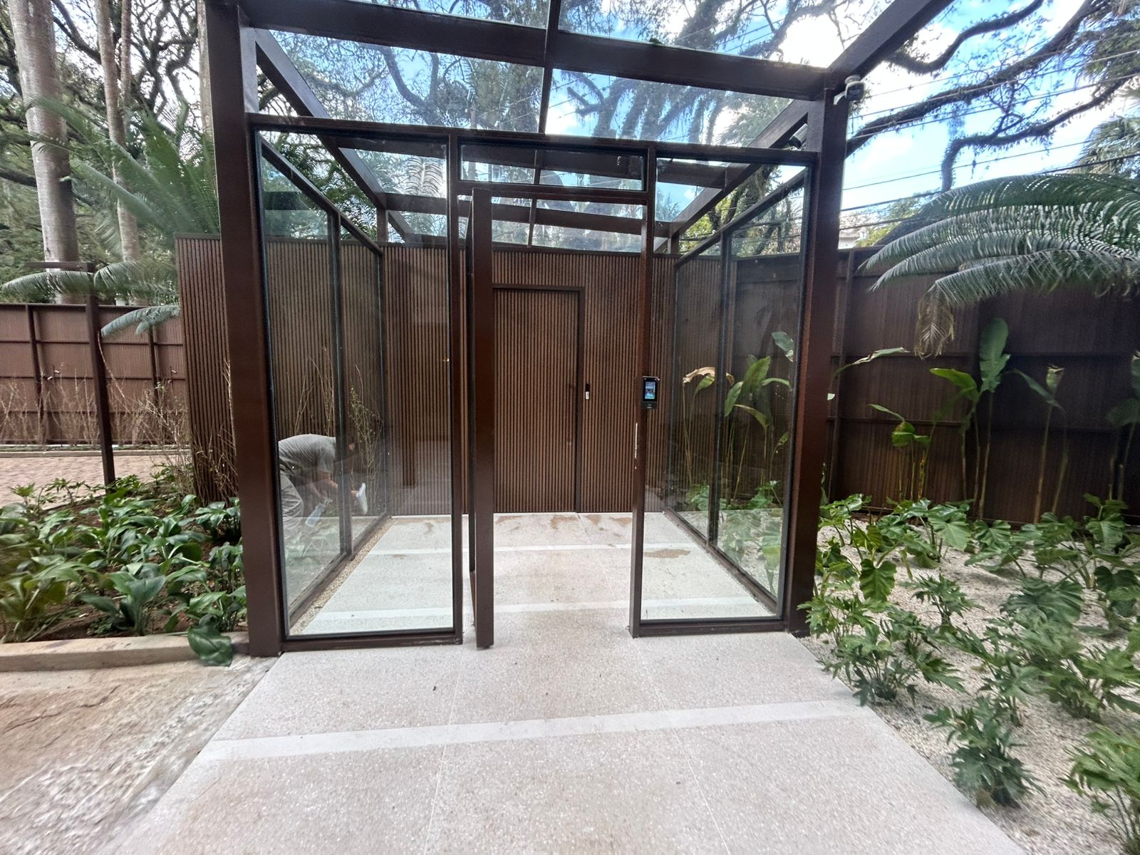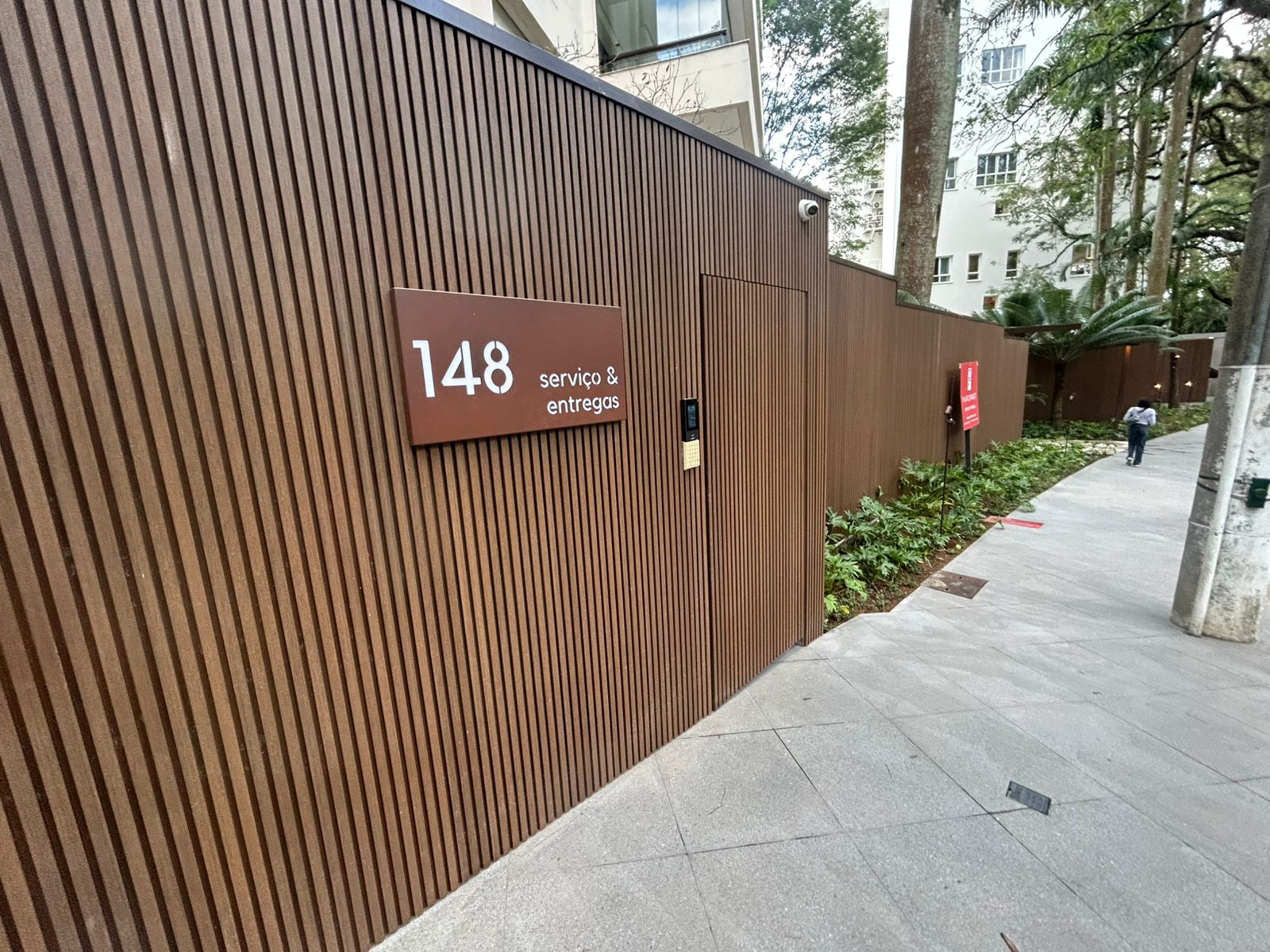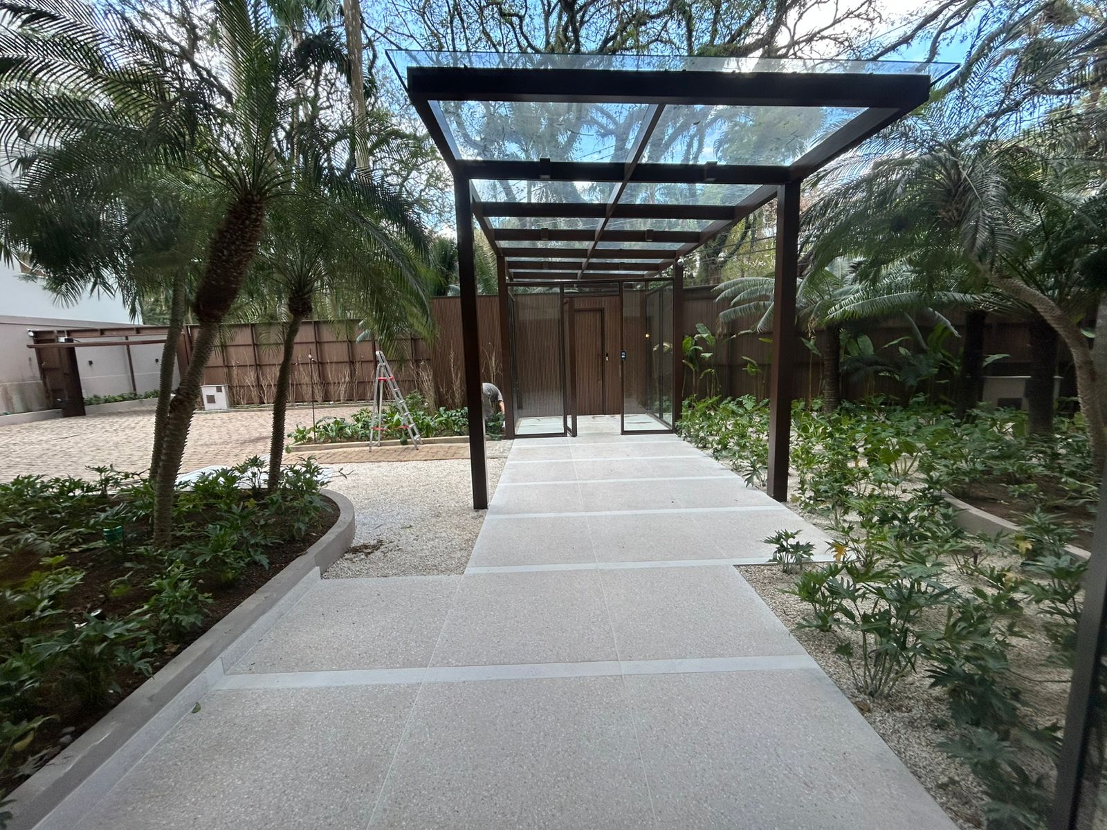 Nova entrada social com pergolado e clausura para pedestres e visitantes.